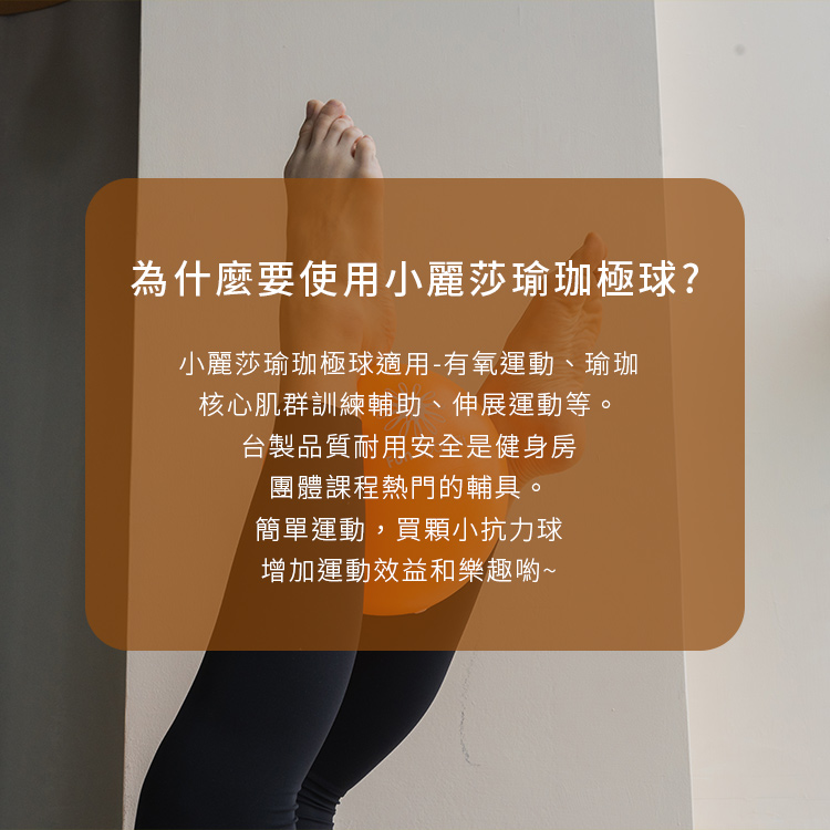 小麗莎瑜珈極球適用-有氧運動、瑜珈、核心肌群訓練輔助、伸展運動等。台製品質,耐用安全,是健身房團體課程熱門的輔具。簡單運動,買顆小抗力球,增加運動效益和樂趣喲~