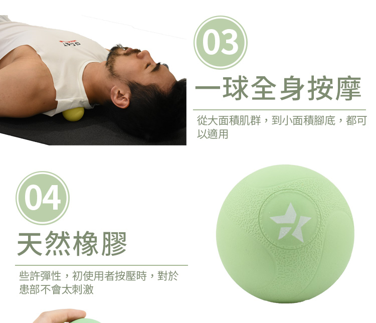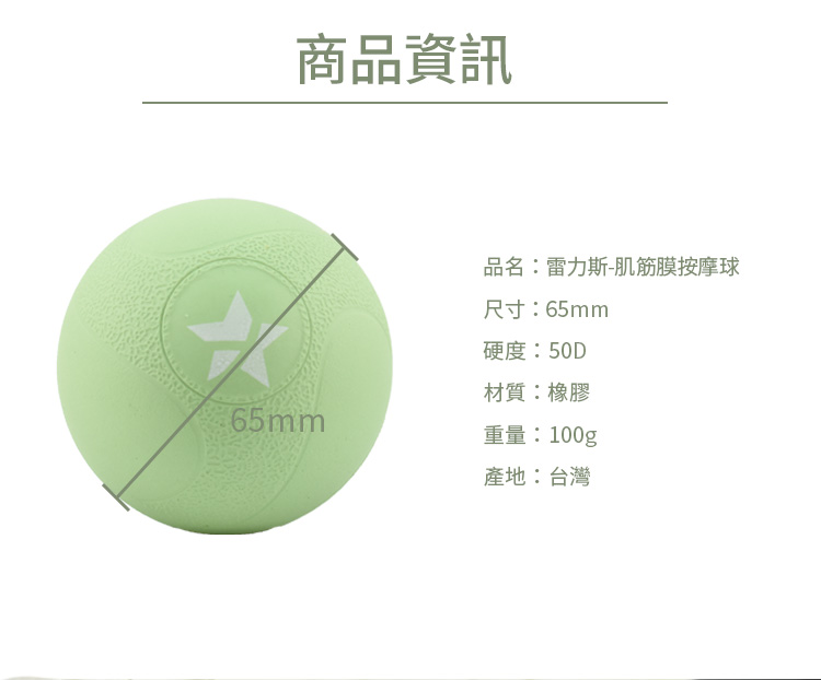 雷力斯-肌筋膜按摩球(6.5cm-60D)-針對不同按摩需求,準備不同硬度及大小的按摩球,一球可按全身,從大面積肌群到小面積腳底都可以按摩舒壓。