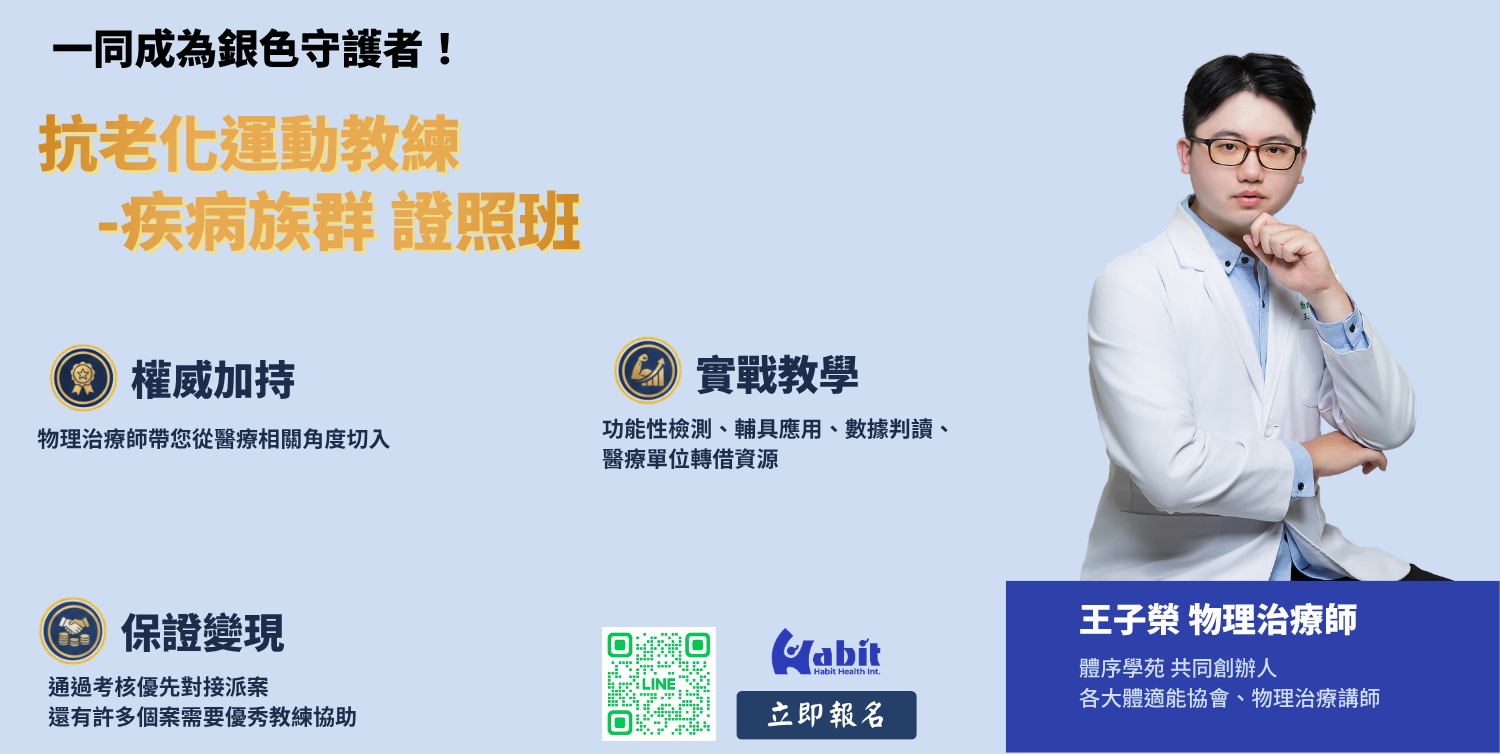 加入抗老化運動培訓,學習針對帕金森、中風、糖尿病等疾病的運動策略,提升你的專業競爭力!適合健身教練、物理治療師與健康專業人士。這將不僅提升你的專業能力,也讓你在健身與復健領域更具影響力!!