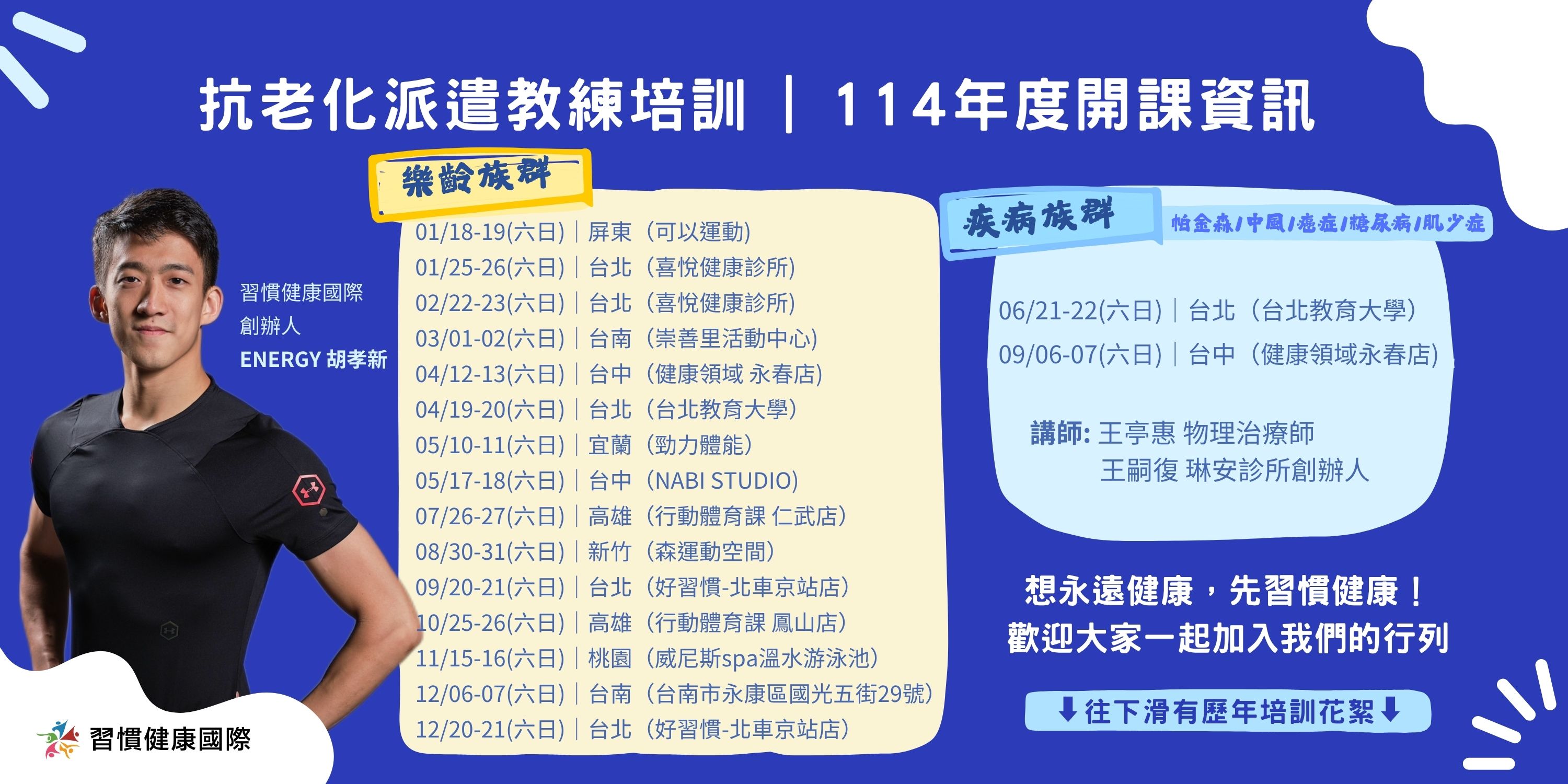 全台走透透,讓健康一站站落地實踐 更多 ----> 2025/09/20-21 抗老化運動派遣教練培訓 台北場(樂齡) 2025/06/21-22 抗老化運動派遣教練培訓 台北場(疾病) 2025/05/17-18 抗老化運動派遣教練培訓 台中場(樂齡) 2025/04/19-20 抗老化運動派遣教練培訓 台北場(樂齡) 2025/03/01-02 抗老化運動派遣教練培訓 台南場(樂齡) 2025/02/22-23 抗老化運動派遣教練培訓 台北場(樂齡) 2025/01/25-26 抗老化運動派遣教練培訓 台北場(樂齡) 2024/12/06-08 抗老化運動派遣教練培訓 台北場(樂齡) 2024/09/20-22 抗老化運動派遣教練培訓 台北場(樂齡) No posts found